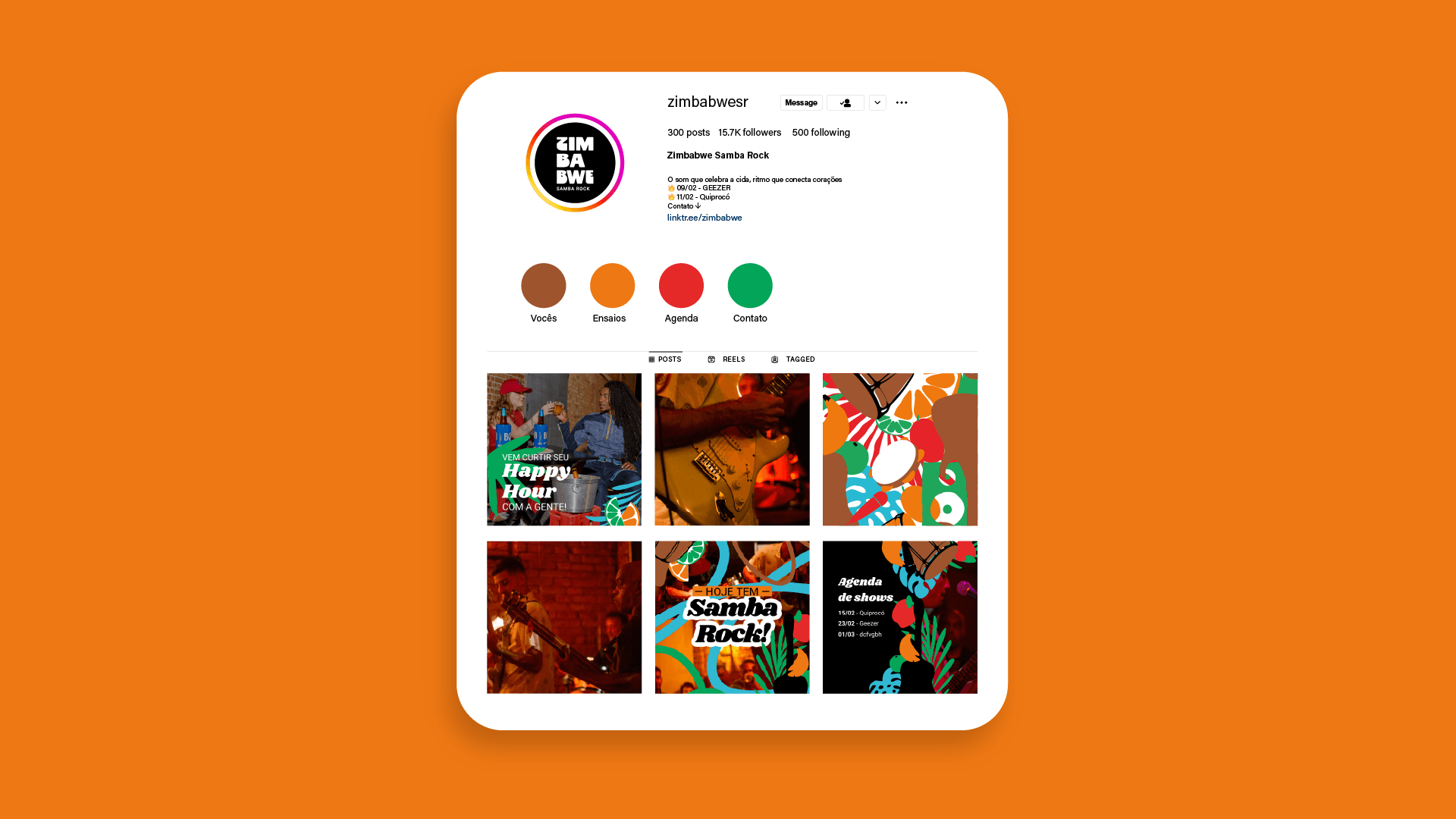A identidade visual da Zimbabwe traduz alegria, criatividade e irreverência com maturidade e profissionalismo. A marca carrega o espírito do samba rock: espontâneo, artístico e plural, construindo uma presença forte, contemporânea e acessível, que conecta público, música e cultura.